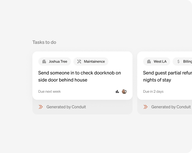 Conduit automates high-volume guest messaging, answers FAQs, handles booking and availability questions, and manages check-in/check-out details across all your channels. It also boosts upselling, coordinates guest services and requests, and triages complex issues to staff so teams are free to focus on added-value tasks to grow your business.