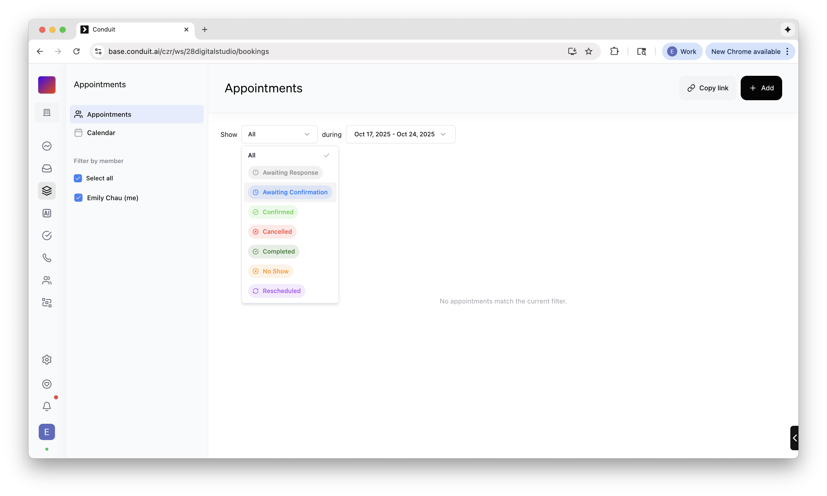 In Conduit, appointments have never been easier to manage! For our LTR and e-commerce customers, appointments can now natively be managed within Conduit for booking tours, scheduling calls, and finding a time to call back.