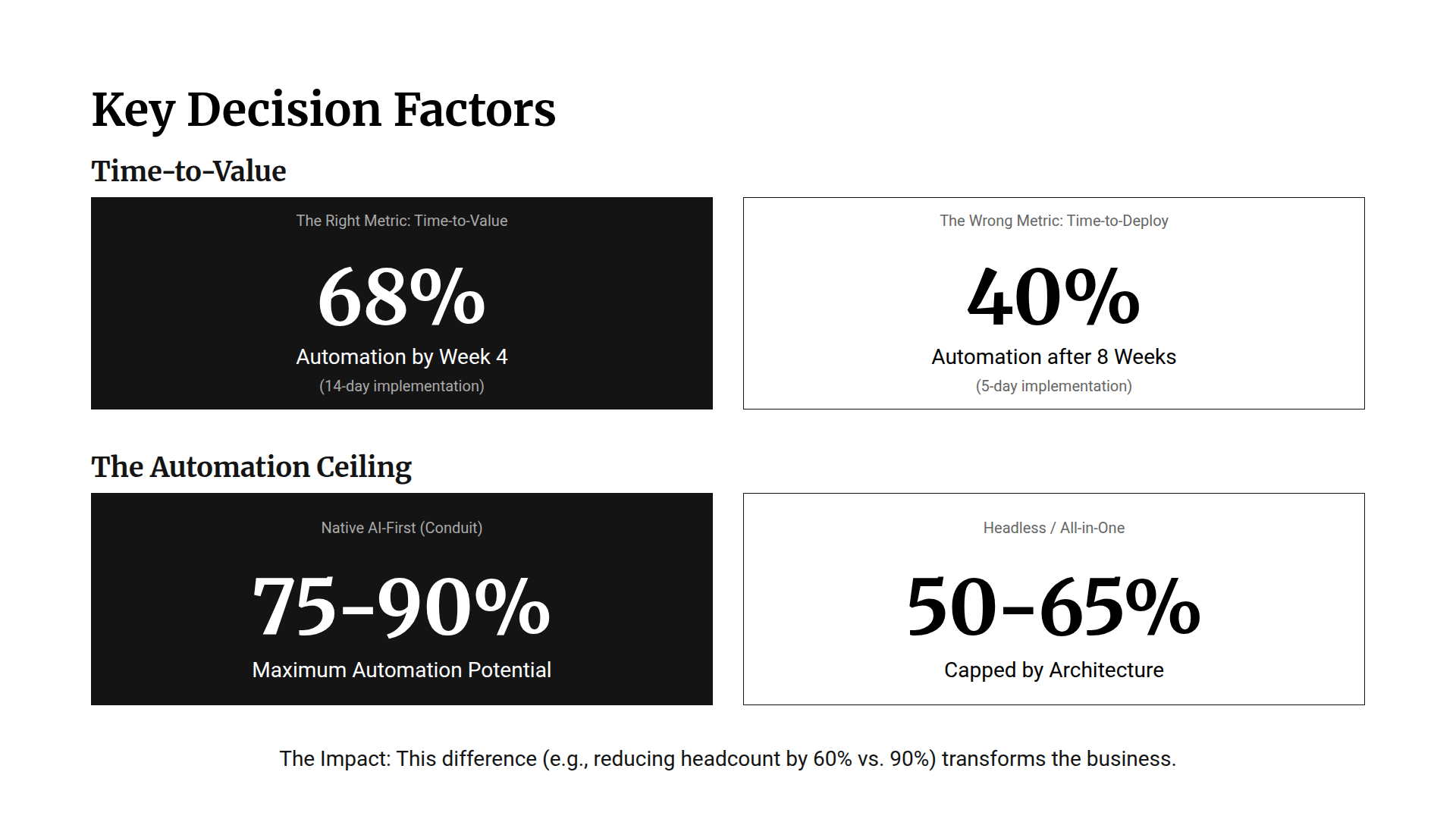 That difference compounds. After 6 months, you're either reducing headcount by 60% or 90%. Both save money, but one transforms your business.