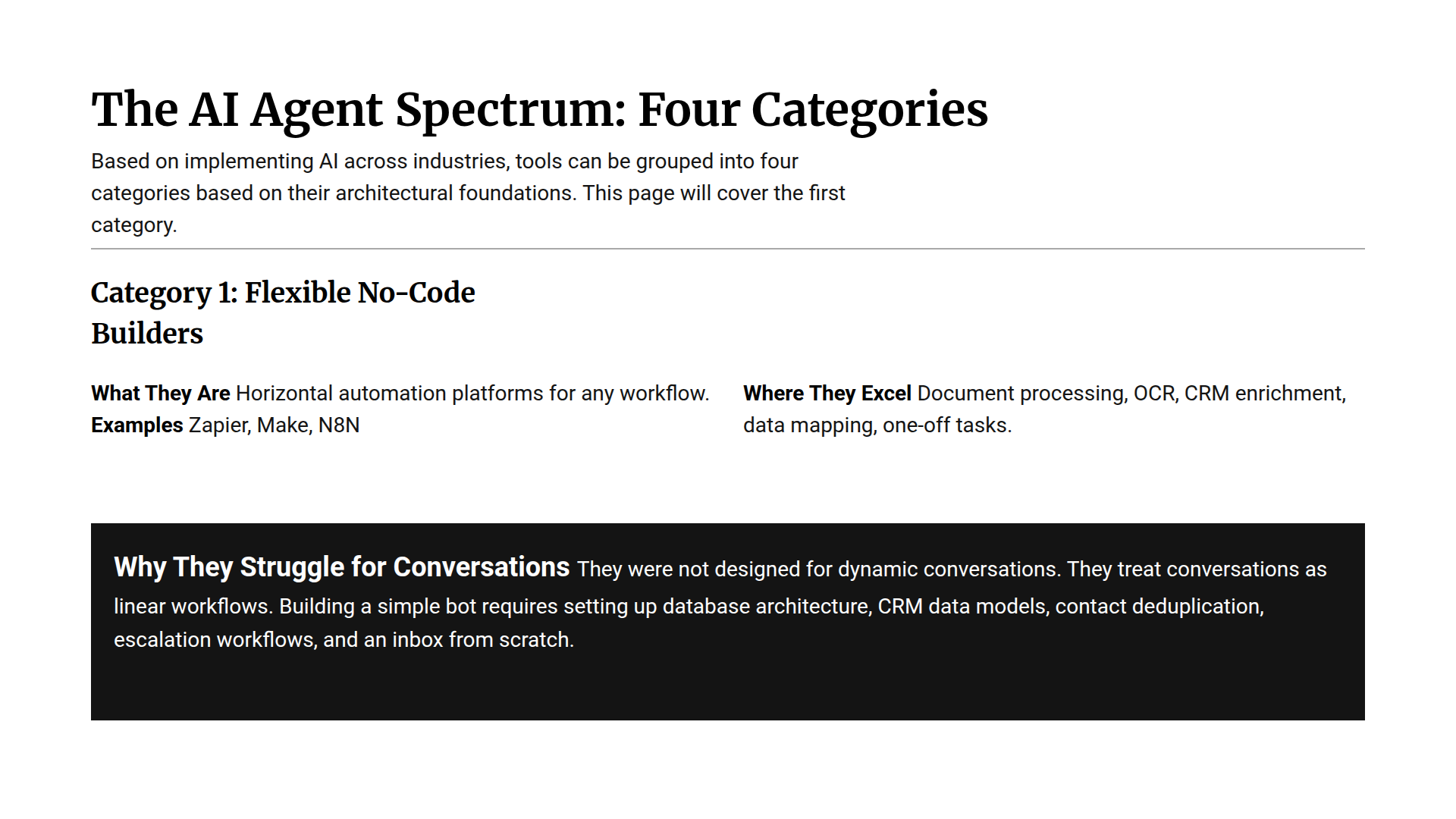 After implementing conversational AI across industries, I've identified four categories of tools. Each has different architectural foundations that determine what they can and can't do.