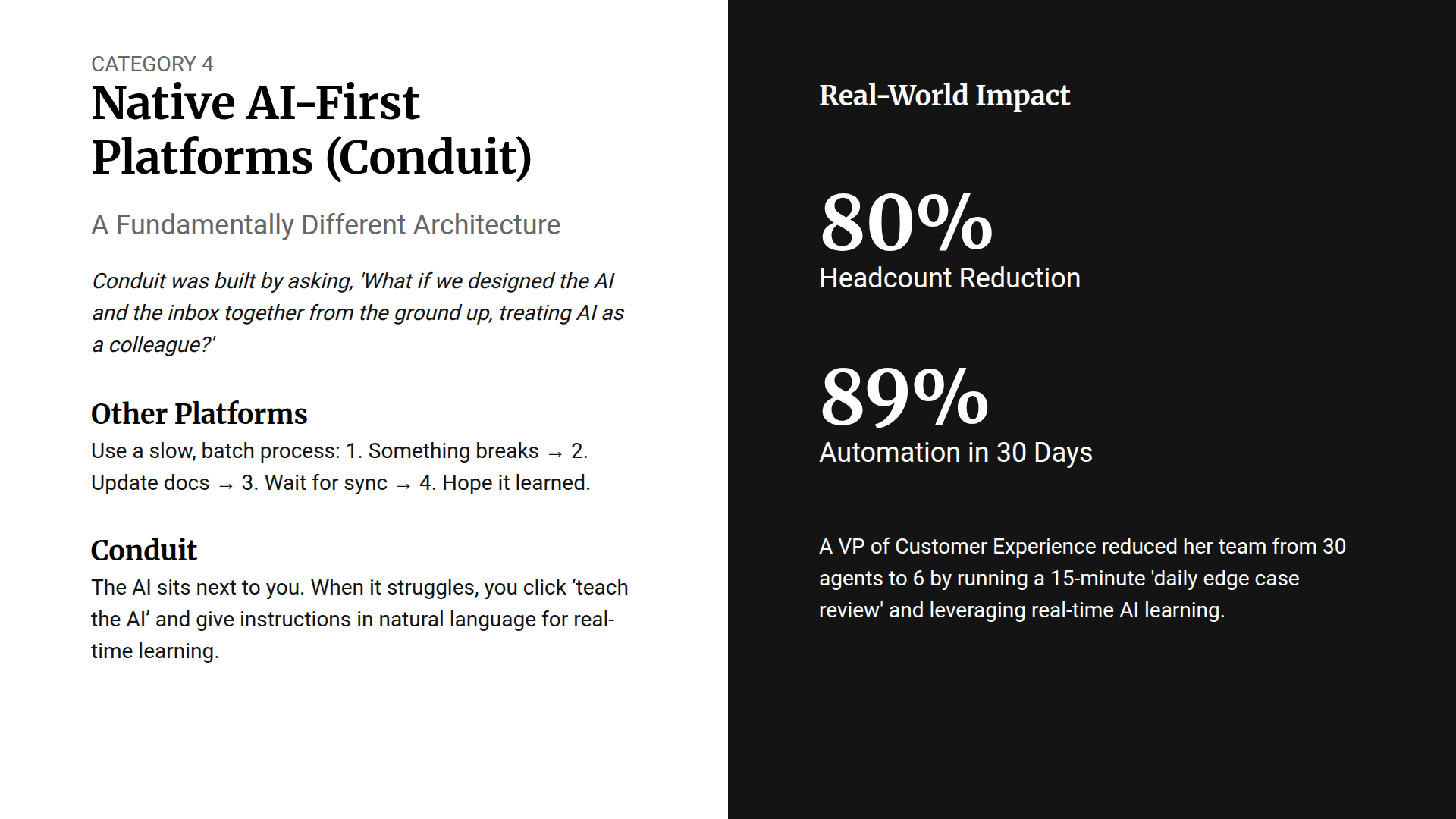 One VP of Customer Experience I worked with reduced her team from 30 agents to 6 (80% headcount reduction) using Conduit.