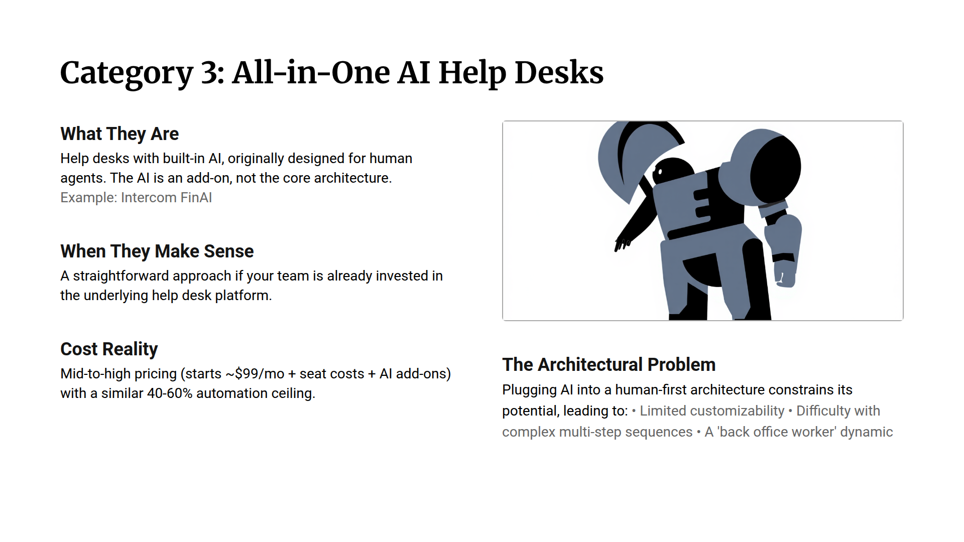 This happens because most platforms are general-purpose tools trying to handle a specialized job, or human centric help desks with AI bolted on as an afterthought.